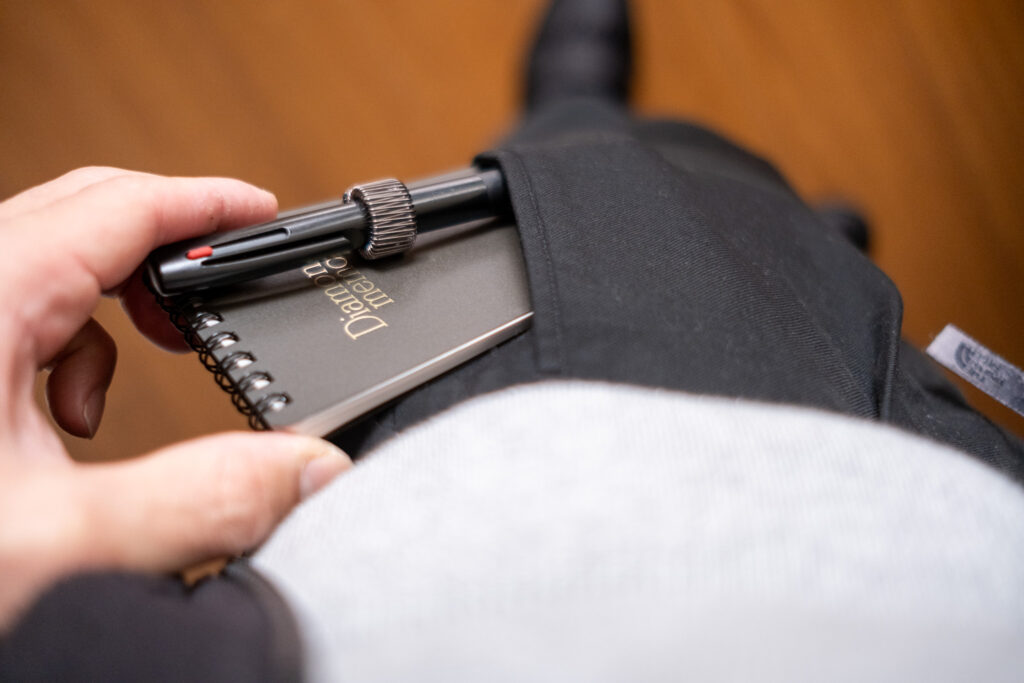 手書きで考えてポケットに入れ、いつでも見返せるようにします。